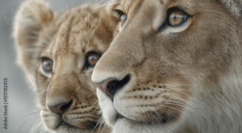 Fototapeta premium Lioness and Cub in Close-Up, Symbolizing Generational Mentorship and Wildlife Conservation, Perfect for Animal Welfare Campaigns