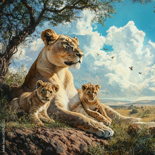 © Escapefrommm, Fototapeta premium Lioness and cubs relaxing in the savanna wildlife photography african landscape natural habitat close-up view