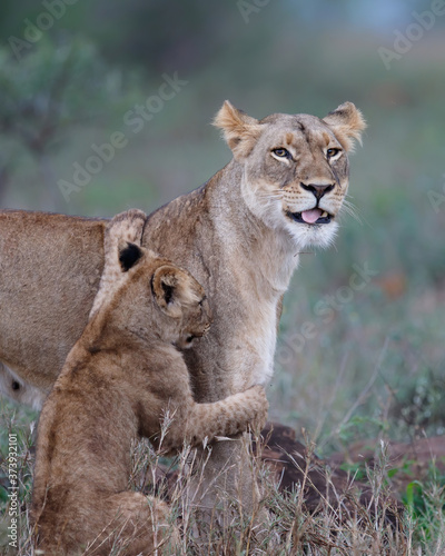 Fototapeta premium Lioness and her playful cub in Zimanga Game Reserve near the city of Mkuze in South Africa