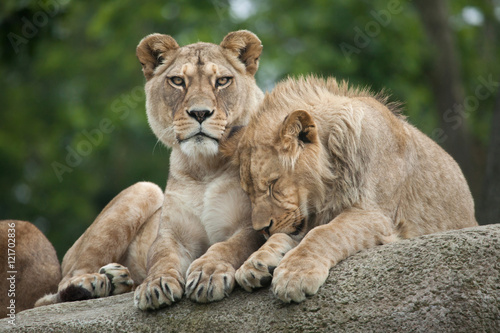 Fototapeta premium Lioness and juvenile male lion (Panthera leo).