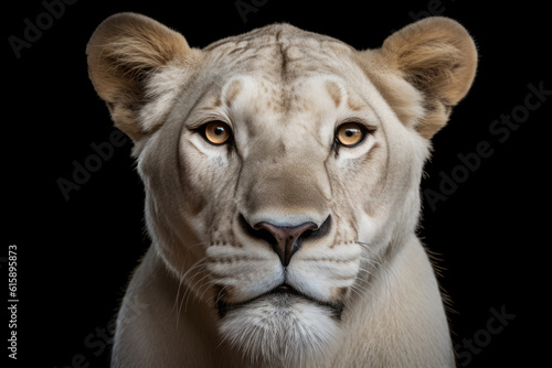Fototapeta premium lioness, front view, black background, hyperrealistic photography, ai generated.