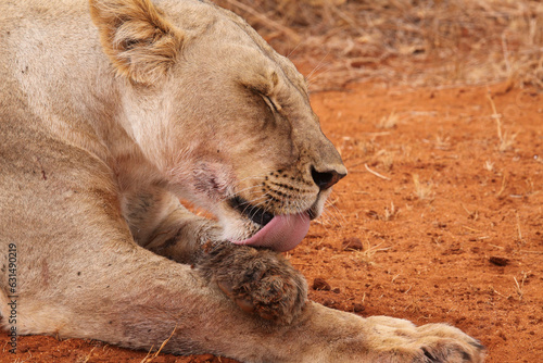 Naklejka premium Lioness in Tsavo East national park in Kenya.
