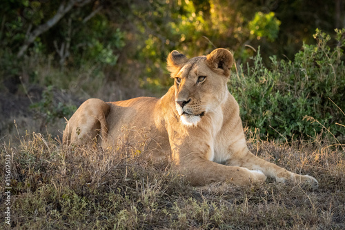 Fototapeta premium Lioness lies in dappled sunshine on grass