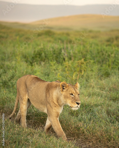 © feeferlump, Naklejka premium Lioness on the green plains at sunrise
