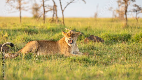 © Gunter, Fototapeta premium Lioness ( Panthera Leo Leo) eating a mongoose, Mara Naboisho Conservancy, Kenya.