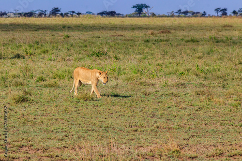 Naklejka premium Lioness (Panthera leo) walking in savannah in Serengeti national park, Tanzania