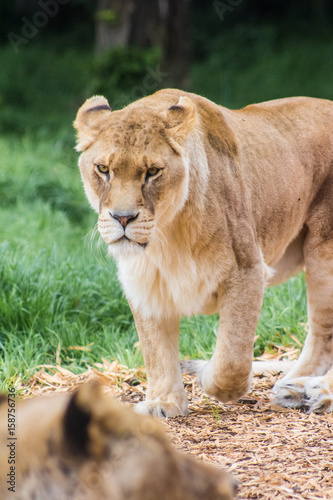 © georgethefourth, Obraz premium Lioness prowls through a grassy environment while looking at the camera