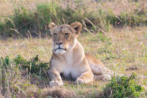 © emccaff2, Naklejka premium Lioness resting in grassy savanna landscape