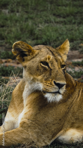 Obraz premium Lioness resting on the savannah, Maasai Mara, Kenya