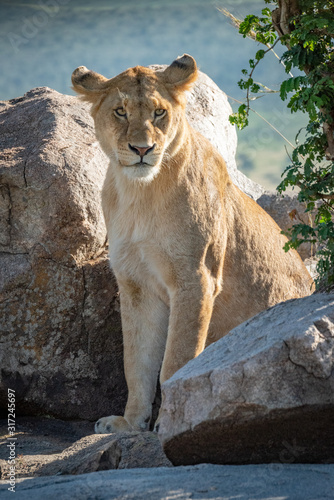 Obraz premium Lioness sits by leafy tree turning head