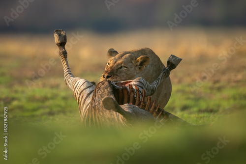 © Nick Dale, Obraz premium Lioness stands chewing zebra kill on grass