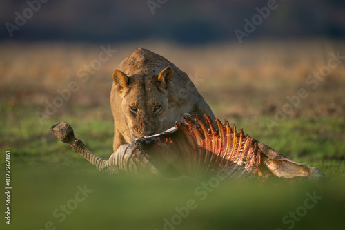 © Nick Dale, Obraz premium Lioness stands feeding on zebra in grass
