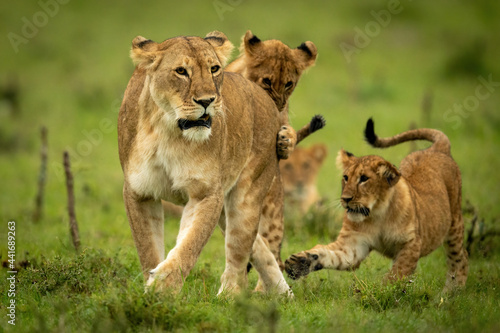 © Nick Dale, Naklejka premium Lioness stands playing with cubs on grass