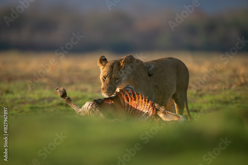 Obraz premium Lioness stands with zebra kill on grass