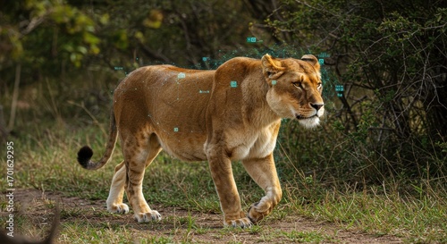 Fototapeta premium Lioness strides through savanna with digital data overlay, showcasing tracking technology