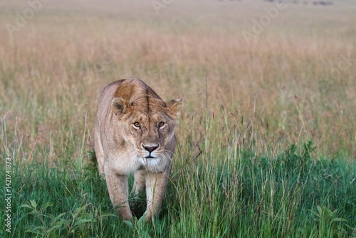 Naklejka premium Lioness walking in the savannah in Kenya
