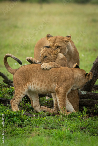 © Nick Dale, Naklejka premium Lioness watches lion cub jump on another