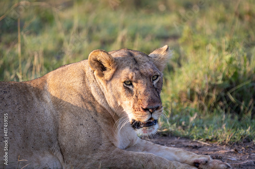 © Amparo Garcia, Naklejka premium Lioness with a bloody mouth after hunting her prey, rests on the grass in the savannah