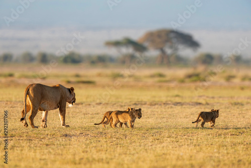 Naklejka premium Lioness with 3 cubs, Amboseli, Kenya, Africa