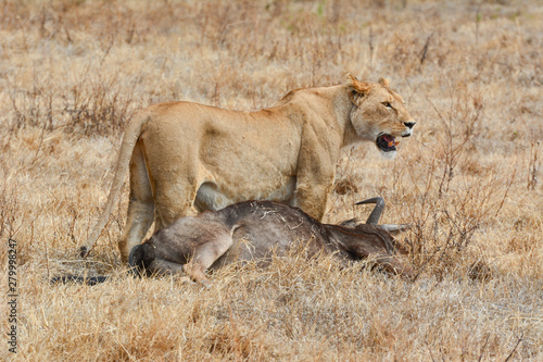 Naklejka premium Lioness with her wildebeast kill