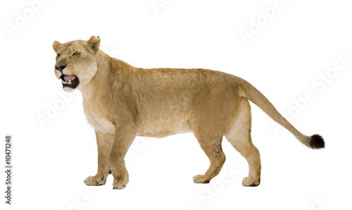 Obraz premium Lioness (8 years) - Panthera leo in front of a white background