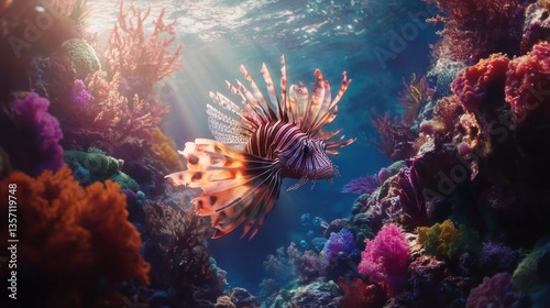 © Nahwu, Obraz premium Lionfish swims coral reef sunlight ocean aquarium