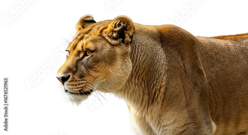 Fototapeta premium Lionne majestueuse regarde loin lumiere douce fond blanc. AI Generated