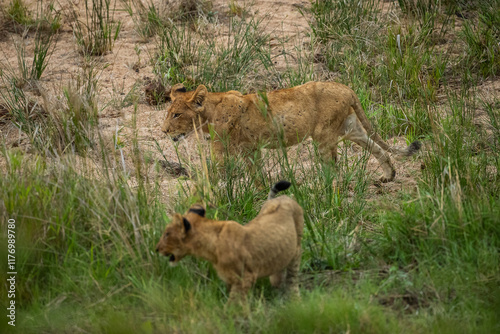 © Tyrone, Fototapeta premium Lions walking in a dry riverbend