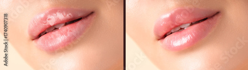 Fototapeta premium Lip care. Woman with chapped and dry skin before and healthy skin after...
