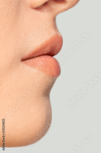 © master1305, Obraz premium Lips. Close up portrait of beautiful jewish female model. Parts of face and body. Beauty, fashion, skincare, cosmetics, wellness concept. Copyspace. Well-kept skin, fresh look, details.