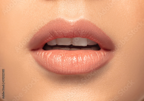 Obraz premium Lips, smile. Close up portrait of beautiful young woman on studio background. Concept of cosmetics, makeup, natural and eco treatment, skin care. Shiny and healthy look, fashion, healthcare. Details.