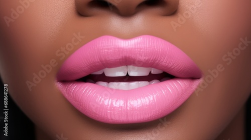 Obraz premium Lips with pink lipstick and white teeth of a beautiful, elegant, sexy African...