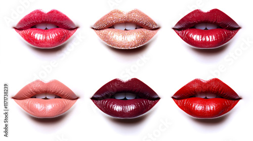 © Michael, Obraz premium Lipstick palette showcasing vibrant red, pink, and nude hues painting sensual female lips, epitomizing romantic Valentine's beauty