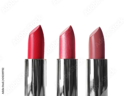 Obraz premium Lipsticks of different shades on white background