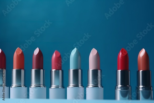 © Stock Photo Zone, Obraz premium lipsticks, row, blue background, lipsticks, row, blue background, cosmetics, beauty, makeup, fashion, lipstick shades, lipstick colors,