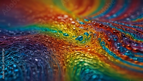 © claudunia, Obraz premium Liquid crystals morphing into rainbow-colored waves over glass.