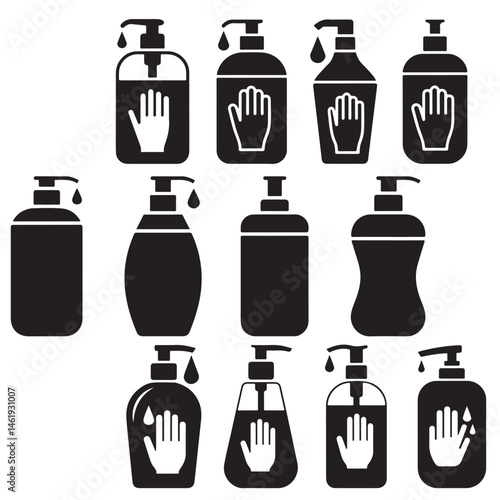 Fototapeta premium Liquid soap Hand sanitizer icon, Silhouettes of Pump Bottles Dispenser, Soap Dispenser Icons Black and White, Outline Illustrations of Pump Bottles for Soap or Lotion,