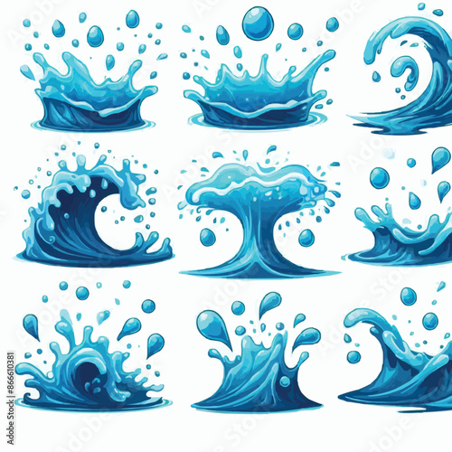 © Shahin Design, Fototapeta premium Liquid water splashes, falling aqua drops, sea or ocean waves and swirl. Blue water motion effects vector cartoon set