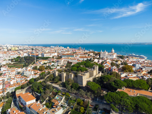 © jakartatravel, Fototapeta premium Lisbon, Portugal: Aerial drone view of the Lisbon medieval castle in the old town in Portugal capital city with the Tages river in the background