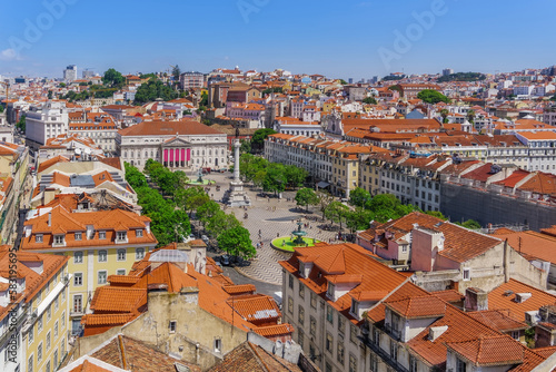 © bestravelvideo, Obraz premium Lisbon, Portugal panoramic landscape of Dom Pedro IV square, Praca Dom Pedro IV, with column surrounded by traditional low-rise red tile rooftop buildings and Teatro Nacional D. Maria II.