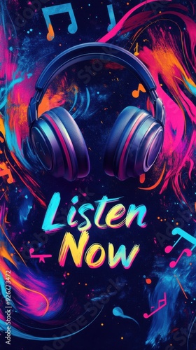 Obraz premium Listen Now - Vibrant and Dynamic Headphone Art with Abstract Musical Notes