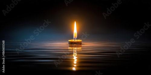 © RaadCreative, Fototapeta premium Lit Candle Flame Reflecting in Water with Dark Background Showing Warm Yellow Light and Blue Tones