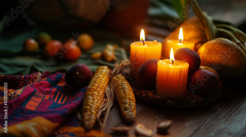 Obraz premium Lit candles with corn and fruits on a wooden table