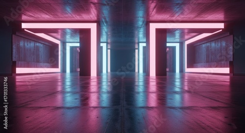 Fototapeta premium Lit corridor with pink/blue neon framing openings