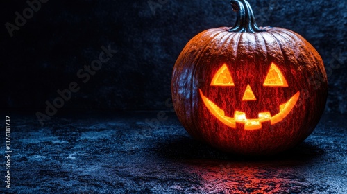 © Kristina, Naklejka premium Lit Jack-o'-lantern on dark background. Glowing Halloween pumpkin with carved face. Festive autumn decoration.