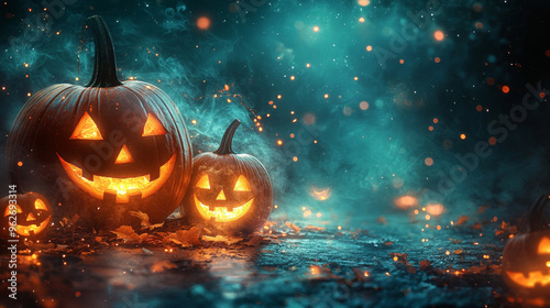 Fototapeta premium Lit jack-o'-lanterns glow ominously in the dark.