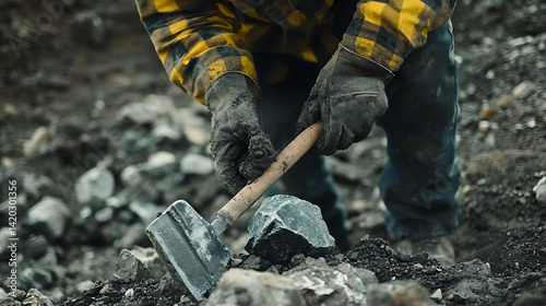 Fototapeta premium Lithium miner carefully extracting rock samples from an active excavation...