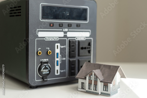 © Angelov, Obraz premium lithium Portable Power Station is charging laptop smartphones Power banks and other gadgets. Modern, information technology. Control panel. close up. Home