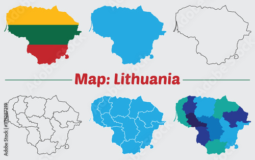 © BestBuyPoints, Obraz premium Lithuania country map set. internal provinces borders marked, Simple map of Lithuania vector drawing, Filled and outline.