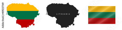 © Ivan Burchak, Obraz premium Lithuania. Map with masked flag. Detailed silhouette. Waving flag. Vector illustration isolated on white.